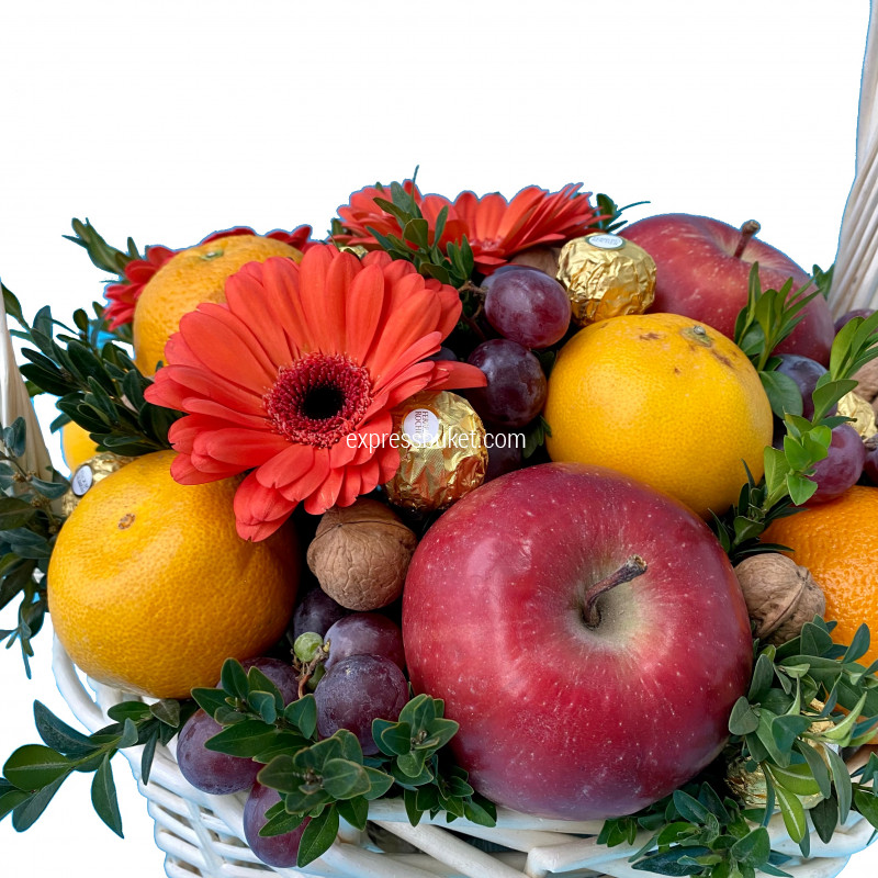 Корзина большая (от 25 см) - 1;Фруктовый микс - 1;Конфеты Ferrero Rocher 125г - 5;Гербера - 3;