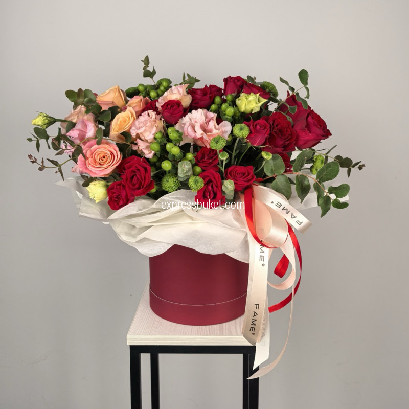 Упаковочный материал - 1;Лента атласная - 1;Коробка шляпная средняя (от 12 до 21 см) - 1;Оазис - 1;Роза кустовая - 4;Гиперикум - 3;Эвкалипт большой - 2;Роза Мисс Пигги (50см) РОССИЯ - 5;Роза 40 см - 4;Эустома - 2;Хризантема кустовая зеленая - 2;