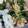 Хризантема кустовая зеленая - 2;Хризантема кустовая белая - 1;Альстромерия - 3;Русскус отеч. - 10;Лента атласная - 1;Пленка - 1;